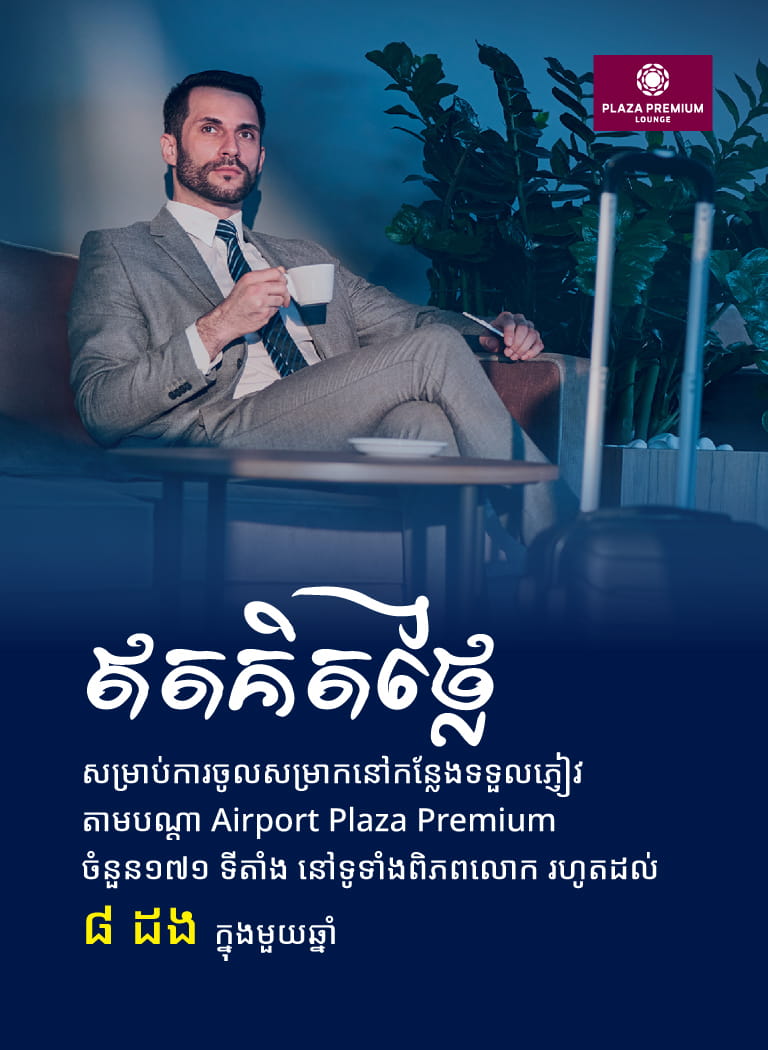 ទទួលបានភាពស្ងប់សុខដោយការសម្រាករង់ចាំ មុនពេលធ្វើដំណើរដោយចូលទៅកាន់ Airport Plaza Premium Lounge ដែលផ្តល់នូវកន្លែងដែលមានផាសុខភាពដើម្បីសម្រាកមុនពេលធ្វើដំណើរបន្ទាប់របស់អ្នក។ រួមទាំងអាហារ និងភេសជ្ជៈឥតគិតថ្លៃ សាកថ្មទូរសព្ទ កន្លែងអង្គុយយ៉ាងស្រួល កាសែតអន្តរជាតិ ទស្សនាវដ្តី និងប៉ុស្តិ៍ទូរទស្សន៍សម្រាប់ការកម្សាន្តរបស់អ្នក។ សូមរីករាយជាមួយសិទ្ធិរបស់អ្នក ដោយគ្រាន់តែបង្ហាញប័ណ្ណឥណពន្ធ RHB Premier VISA ឬ Mastercard របស់អ្នកនៅឯកន្លែងចូល Airport Plaza Premium Lounges ដើម្បីរីករាយជាមួយការចូលប្រើប្រាស់បានរហូតដល់ ៨ដងក្នុងមួយឆ្នាំ ដោយឥតគិតថ្លៃជាមួយដៃគូរបស់អ្នក។